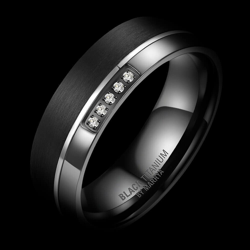 Ein schwarzer Damenring aus Black Titanium. Eine Kombination aus 49% Titan und 51% Zirkonium vereint zu einem ganz besonderen Materialgemisch. Dieser 6mm breite und ca. 1,8mm starke Ring ist tiefschwarz und anthrazit mit hellem Titanband. Der Ring ist mit mehreren Zirkonia veredelt. Für angenehmen Tragekomfort sind die Ringe innen bombiert (abgerundet).