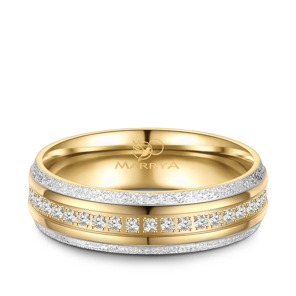 Ein wunderschöner Damenring aus Edelstahl mit erstklassiger 14K IP Gold-Beschichtung. Dieser Edelstahlring ist umlaufend mit mehreren 5A-Zirkonia mit Hochglanzeffekt veredelt, hochwertig verarbeitet und sitzt durch die Bombierung (an der Ringinnenseite abgerundet) sehr bequem am Finger. Die seitlichen Ränder sind oben Edelstahl mattiert, an den Seiten poliert.