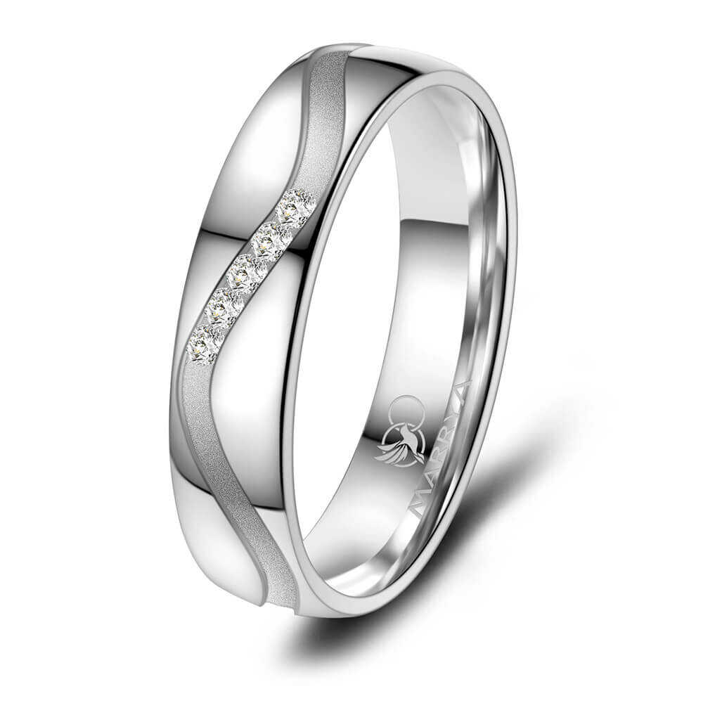 Ein Damenring aus mehrfach rhodiniertem 925er Sterlingsilber. Dieser Silberring mit qualitativ hohem Anlaufschutz und fünf Zirkonia ist hochwertig verarbeitet und sitzt durch die Bombierung (an der Ringinnenseite abgerundet) sehr bequem am Finger.
