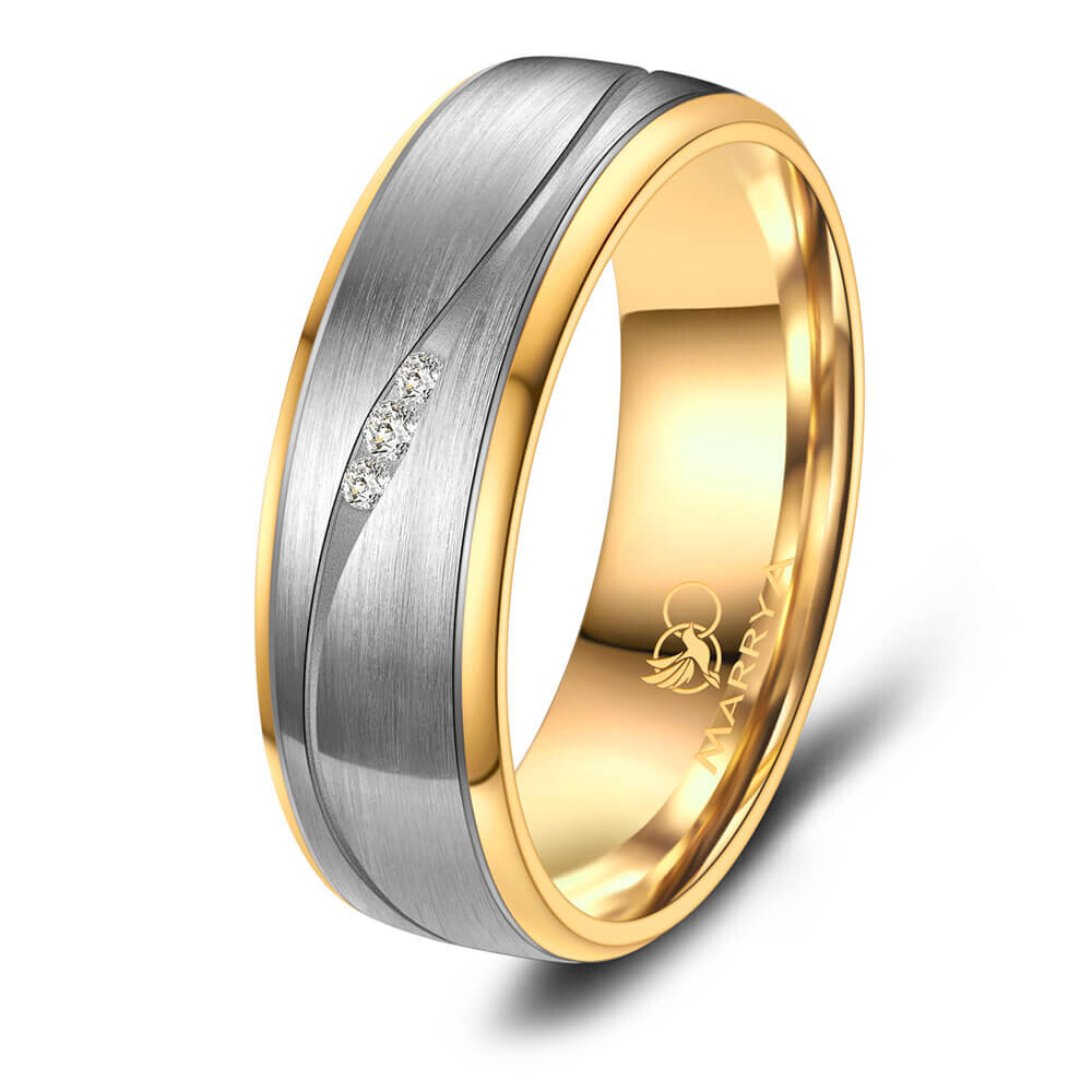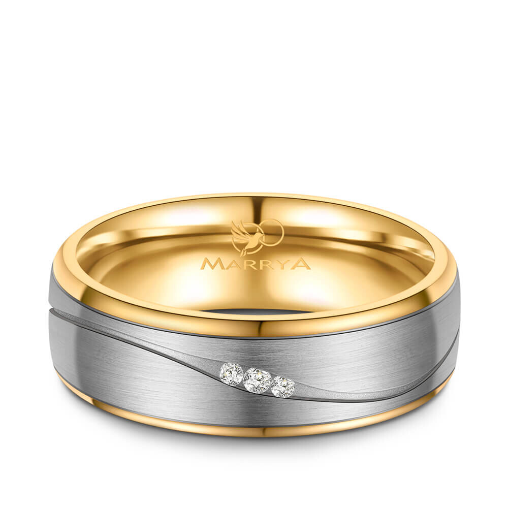 Ein Hochwertiger Damenring aus robustem Titan mit 14K IP Beschichtung in Gold. Dieser Titanring ist in Top Qualität gefertigt und teilweise mattiert. Er sitzt durch seine Bombierung (an der Ringinnenseite abgerundet) sehr bequem am Finger. Der Ring ist mit drei echten Diamanten veredelt.