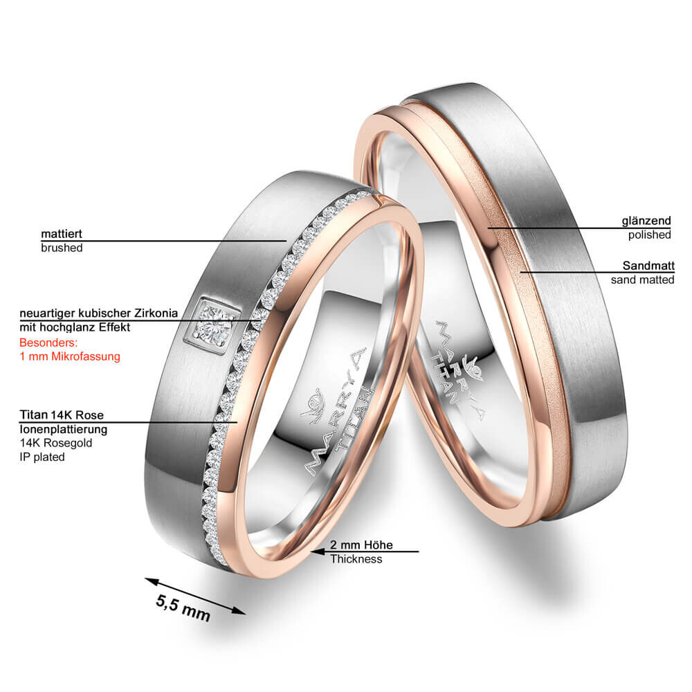 Dieser in 14K Roségold Ionenplattierung in hochglanz sowie Titan grau mattiert gehaltene Ring ist etwas ganz Besonderes. Mit mehreren neuartigen kubischen Zirkonia mit Hochglanzeffekt veredelt. Die Fuge ist in sandmatt gehalten. Titan ist für seine vergleichsweise hohe Kratzfestigkeit und Stabilität bekannt, trotzdem ist es relativ leicht. Zusätzlich ist der Ring von innen abgerundet (bombiert). Dies sorgt für ein besonders angenehmes Tragegefühl am Finger.