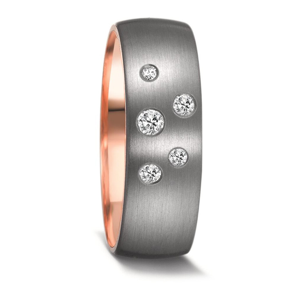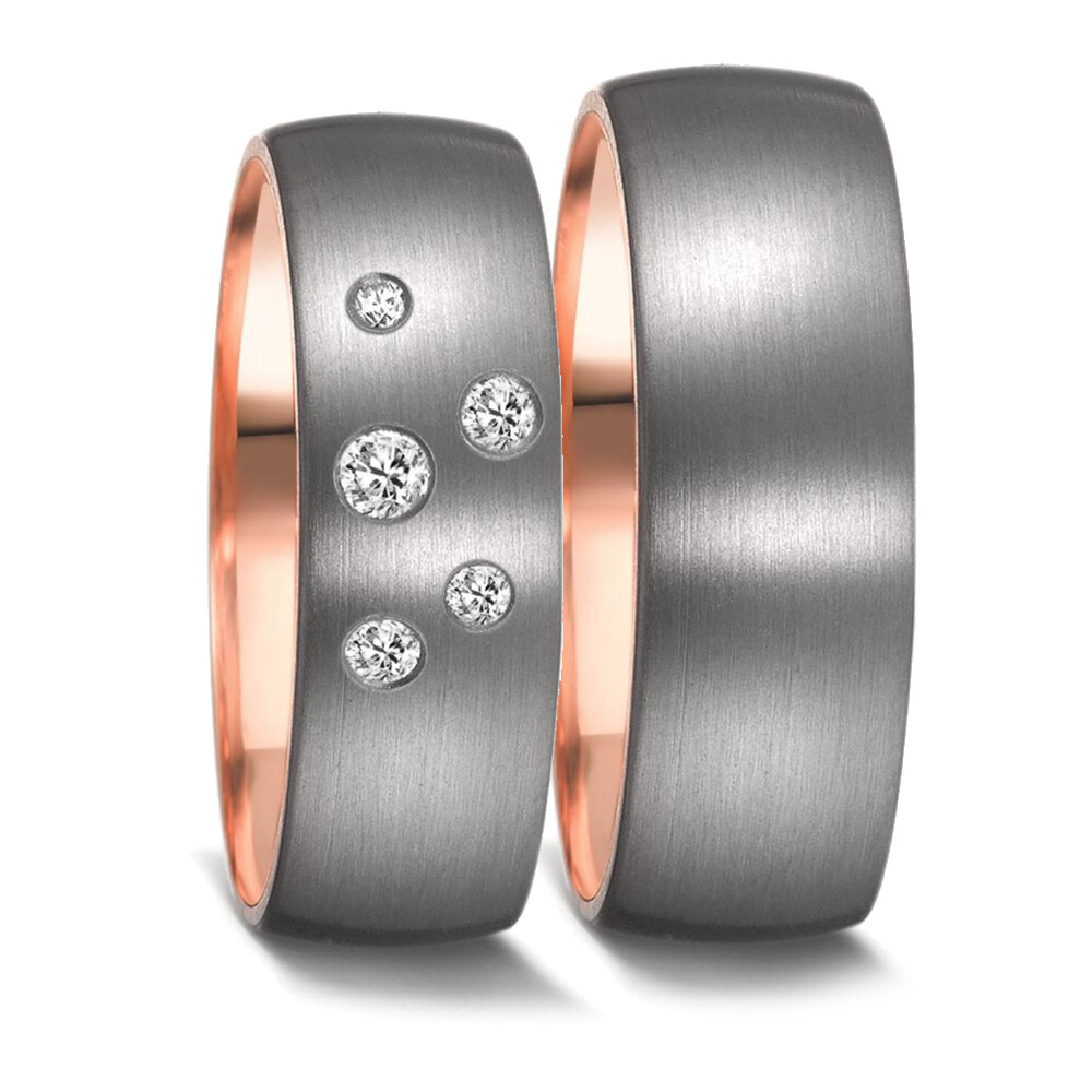 Sehr breite Partnerringe aus Tantal mit einer Innenseite aus 585er Rotgold und mattierter Oberfläche. Der Damenring ist dabei mit mehreren funkelnden Diamanten (ges. 0,140 ct. w/si) besetzt. Beide Ringe, welche auch als Freundschaftsringe getragen werden, sind innen und außen leicht bombiert. Das sorgt für ein hervorragendes Tragegefühl. Tantal ist ein sehr kratzfestes Material welches zudem äußerst unempfindlich gegenüber Tragespuren ist. Gern gravieren wir diese Ringe mit Ihrem Wunschtext.