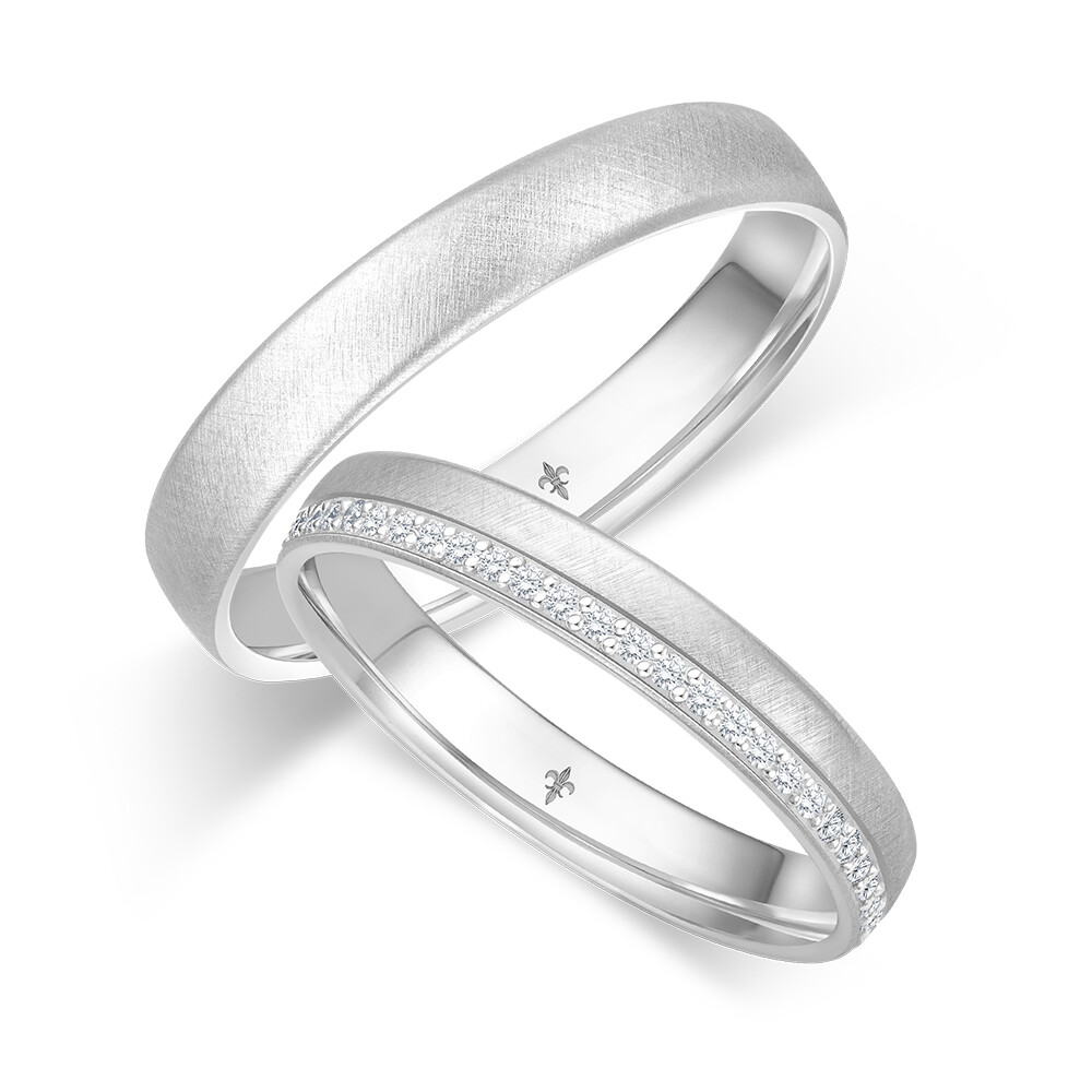 Faszinierende Trauringe und Eheringe Elsa aus Weißgold mit mattierter Oberfläche (Eismatt). Der Damenring ist mit mehreren lupenreinen Diamanten im Brillantschliff veredelt. Beide Ringe sind bombiert, für angenehmen Tragekomfort.