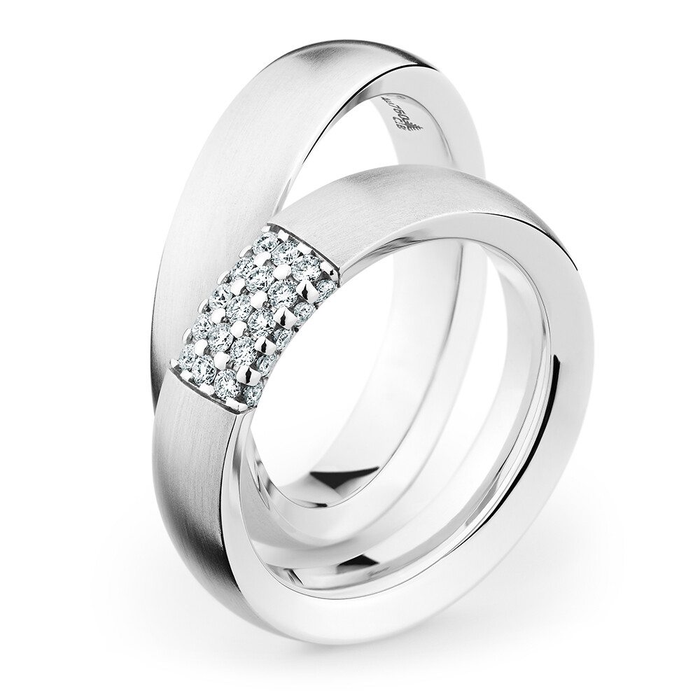 Faszinierende Eheringe aus Weißgold. Der Damenring ist mit mehreren funkelnden Brillanten mit insgesamt 0.230 ct. tw/si veredelt. Beide Ringe sind bombiert, für optimalen Tragekomfort.