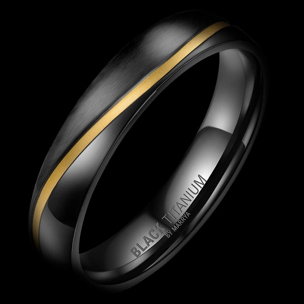 Ein schwarzer Herrenring aus Black Titanium. Eine Kombination aus 49% Titan und 51% Zirkonium vereint zu einem ganz besonderen Materialgemisch. Dieser 4,5mm breiten und nur 1,8mm starke Ring ist tiefschwarz, teilweise längsmatt in Kombination mit feiner goldener Beschichtung in einer Saturnfuge! Für angenehmen Tragekomfort ist der Ring innen bombiert (abgerundet).