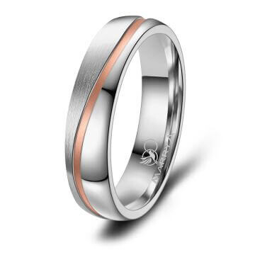 Hochwertiger Bicolor Ring aus Edelstahl mit einer faszinierenden Wellenfuge mit erstklassiger 14K Rosé-Beschichtung. Eine Hälfte des Rings ist glänzend poliert, die andere Hälfte matt gebürstet. Die roséfarbene Fuge ist in feinem sandmatt gehalten. Dieser wunderschöne Edelstahlring ist hochwertig verarbeitet und sitzt durch seine Bombierung (an der Ringinnenseite abgerundet) sehr bequem am Finger.