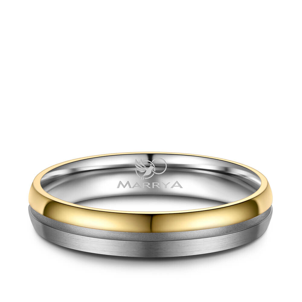 Bicolor Herrenring aus mattiertem Titan mit polierter Gelbgold-Plattierung. Dieser ca. 4mm breite Titanring mit umlaufender Fuge ist hochwertig verarbeitet und sitzt durch die Bombierung (an der Ring-Innenseite abgerundet) sehr bequem am Finger.