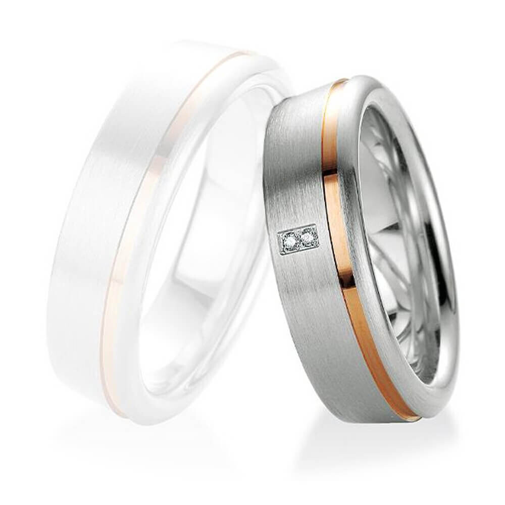 Ein Partnerring aus 925er Silber mit platinierung sowie einer Rotgold-Plattierung in der Fuge als Kontrastelement. Der Ring aus der Kollektion Silver with Diamonds betsicht durch ein elegantes Design sowie zweier echter Diamanten. Für einen optimalen Tragekomfort ist der Ring innen bombiert (abgerundet).