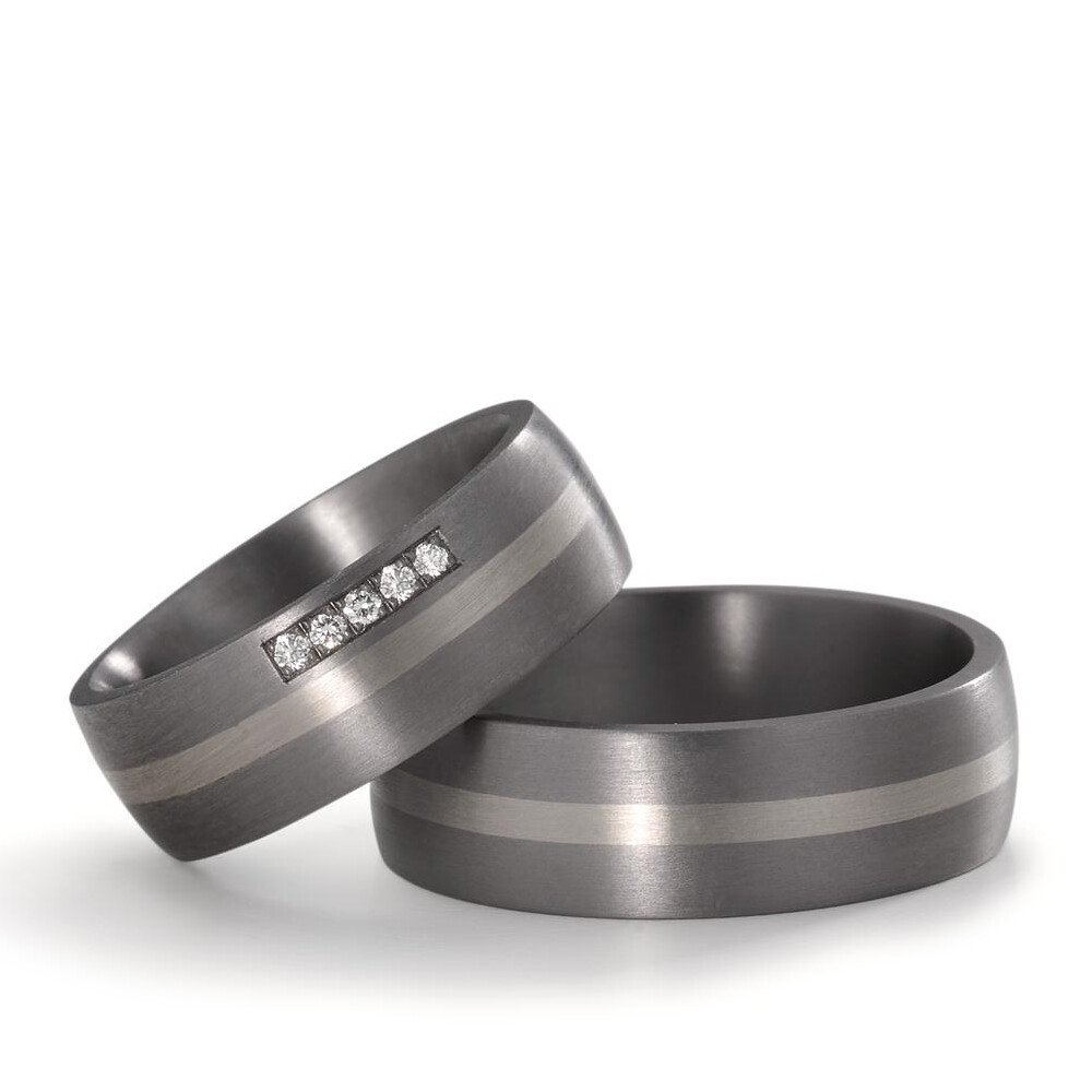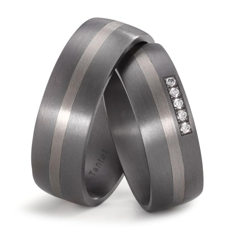 Moderne Partnerringe aus Tantal und Palladium 500 mit mattierter Oberfläche. Der Damenring ist dabei mit mehreren funkelnden Diamanten (ges. 0,050 ct. w/si) besetzt. Beide Ringe, welche auch als Freundschaftsringe getragen werden, sind innen und außen leicht bombiert. Das sorgt für ein hervorragendes Tragegefühl. Tantal ist ein sehr kratzfestes Material welches zudem äußerst unempfindlich gegenüber Tragespuren ist. Gern gravieren wir diese Ringe mit Ihrem Wunschtext.