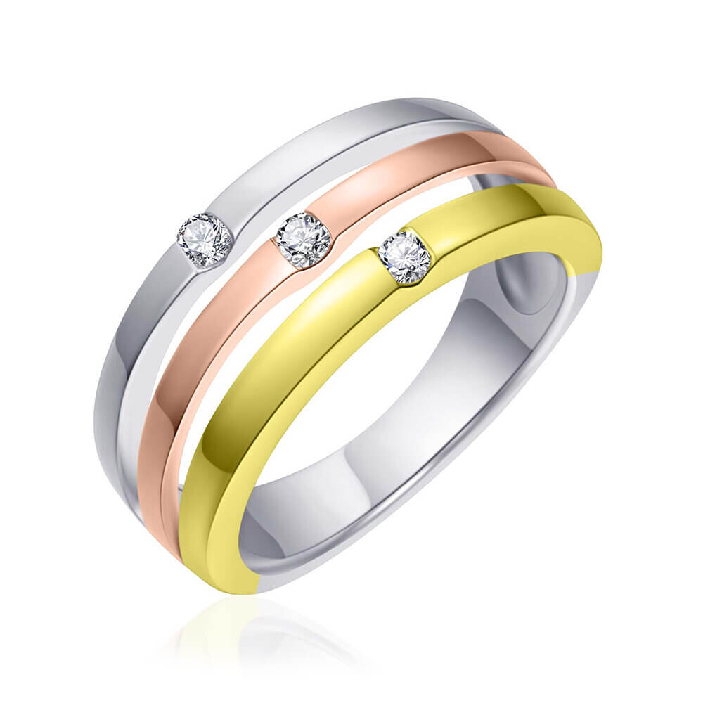 Ein faszinierender Ring aus rhodiniertem und vergoldetem 925er Silber. Der Ring ist mit drei funkelnden Zirkonia veredelt und glänzt mit seiner modernen Optik.