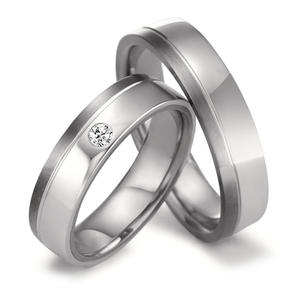 Moderne Trauringe aus 999 Tantal und Platin 950 mit teils mattierter und polierter Oberfläche. Der Damenring ist mit einem funkelnden Diamanten (ges. 0,040 ct. w/si) veredelt. Beide Ringe, welche auch als Partnerringe getragen werden können, sind Made in Germany und aus dem sehr seltenen Material Tantal in Kombination mit Platin gefertigt. Gern gravieren wir diese Ringe mit Ihrem individuellen Wunschtext. Das Ringprofil ist außen gerade und innen bombiert.