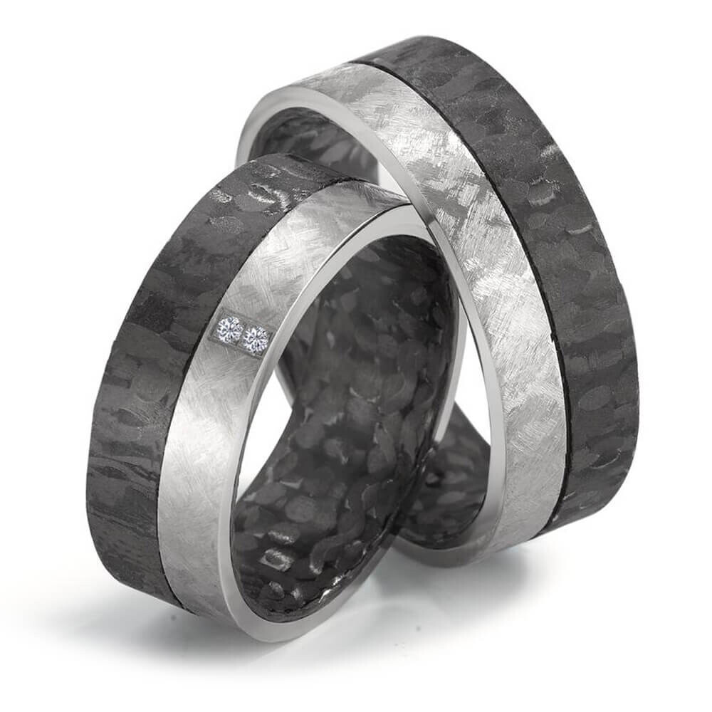 Spezielle Trauringe aus Titan mit Eismatt-Oberfläche und Carbon - so stark, wie eure Liebe! Für alle die das Außergewöhnliche lieben sind diese fantastischen und 8 mm breiten Ringe das Richtige: 2 Brillanten mit 0,02 Carat in Schmuckqualität w/si verzieren den Damenring und lassen ihn strahlen. Die Oberfläche fällt bei diesen super schönen Ringen ganz besonders ins Auge!
