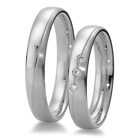 Moderne, romantische Trauringe aus Platin. Diese optisch abgerundet gestalteten Trauringe sind ein echter Hingucker! Eine diagonale Fuge setzt einen schönen Kontrast zwischen dem polierten und dem matten Bereich der Ringe.