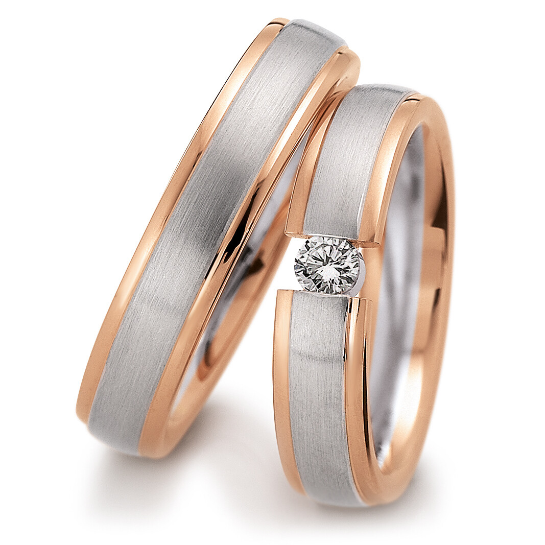 Wunderschöne, zweifarbige Trauringe aus Platin und Rotgold. Für einen optimalen Tragekomfort sind die Ringe innen bombiert (abgerundet).