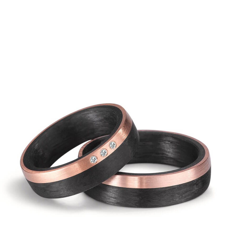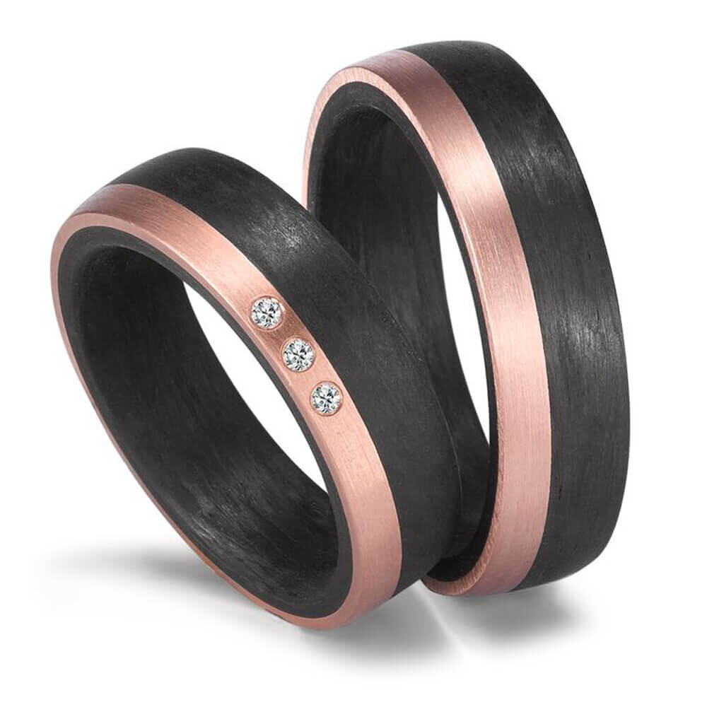 Großartige Trauringe / Partnerringe aus starkem schwarzen Carbon und edelem Roségold ganz spezielle Ringe für alle, die etwas ausgefallenes an der Hand tragen möchten. Der Damenring besitzt 3 strahlende Brillanten in einer gesamt Carat Zahl von 0,03 mit der Schmuckqualität w/si. Ganz besonders, genau wie Eure Liebe!