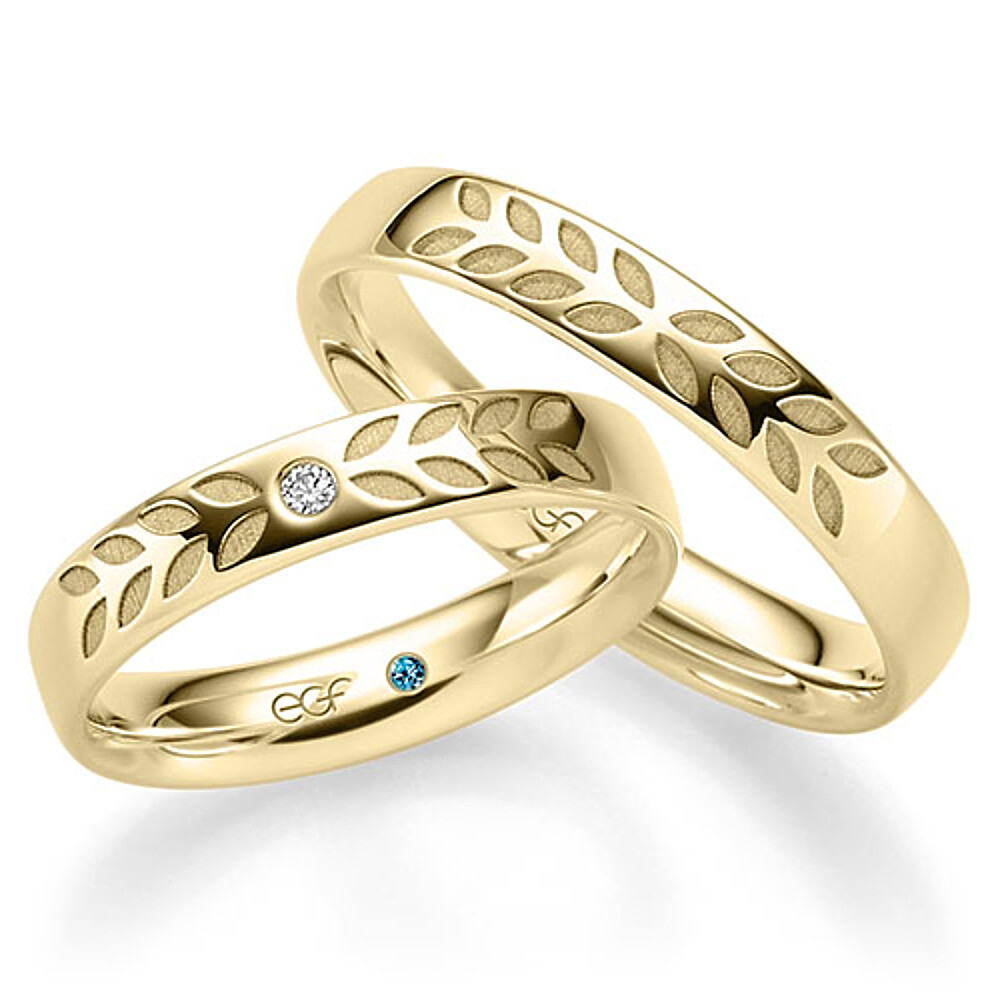 Wunderschöne Eheringe aus Gelbgold mit glänzend polierter Oberfläche und faszinierender floraler Musterung. Der Damenring ist mit mehreren echten Diamanten mit Brillantschliff veredelt. Beide Ringe sind außen leicht und innen stark gewölbt.