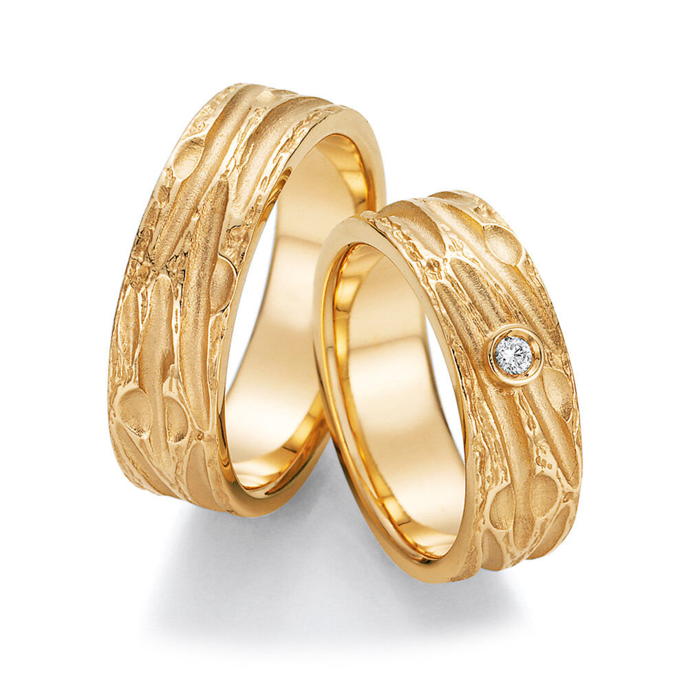 Anmutige Trauringe aus modernem Gelbgold. Der Damenring besitzt einen faszinierenden eingeriebenen Brillanten mit 0,045 Karat w/si und bezaubert wirklich jedes Herz. Das Besondere an diesen großartigen Ringen ist die phantastische Oberfläche mit Muster. Der Brillant kommt auf dieser Oberfläche eindrucksvoll zum Strahlen. Was für eine schöne Symbiose! Ringe so individuell wie eure Liebe.