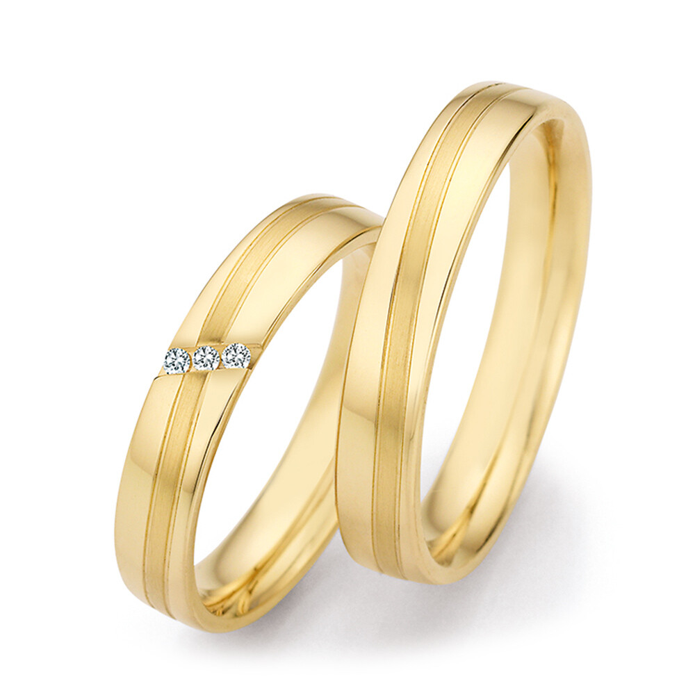 Wunderschöne, elegante Trauringe aus Gelbgold aus der Kollektion Honeymoon Solid XVI mit teils mattierter Oberfläche. Diese edlen Eheringe mit 3 funkelnden Brillanten am Damenring sind für einen angenehmen Tragekomfort bombiert (abgerundet).