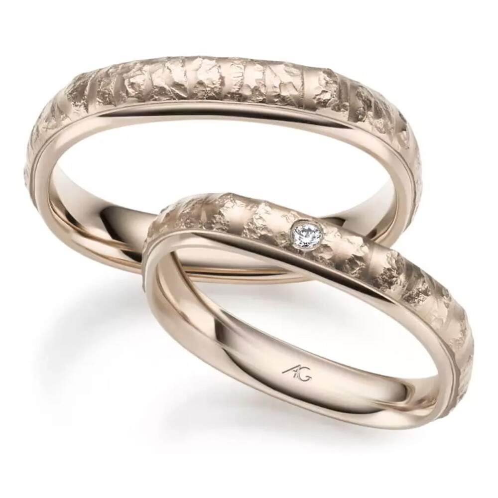 Elegante Trauringe in Fingerform – Square – aus wunderschönem 585er oder 750er Haselnussgold mit ausgefallenen Oberflächendesign. Der Damenring ist mit einem funkelnden Diamanten mit insgesamt 0.020 ct. w/si verziert. Für perfekten Tragekomfort der Ringe sorgt die Bombierung (Abrundung) in den Innenseiten.