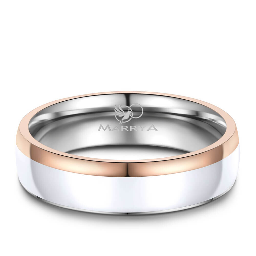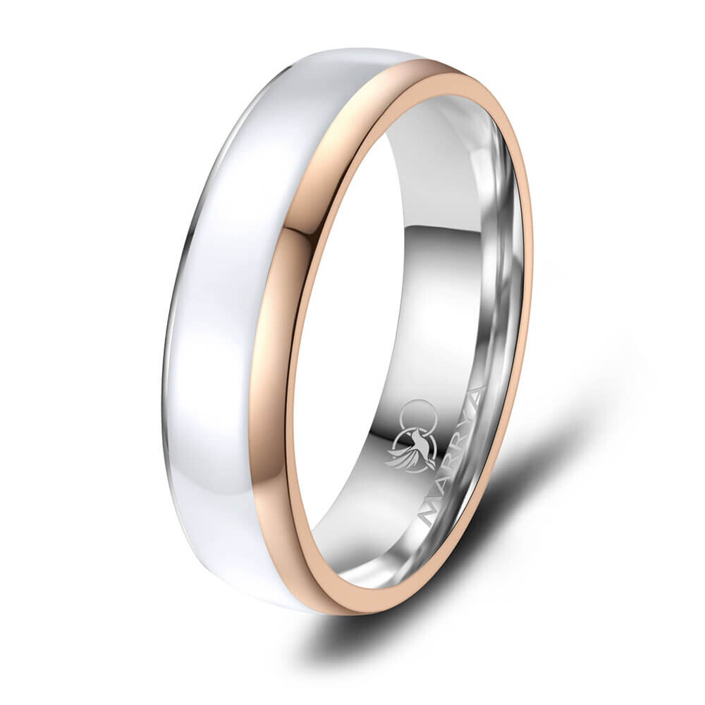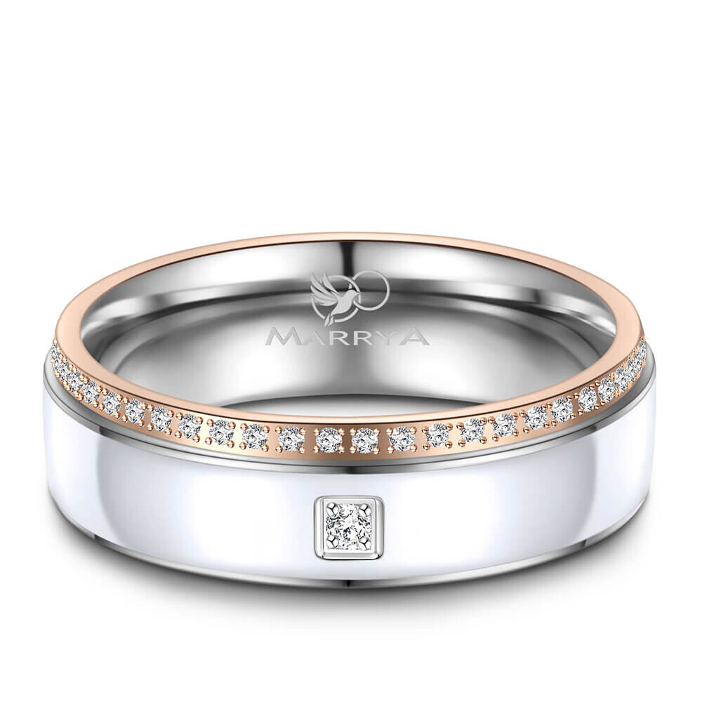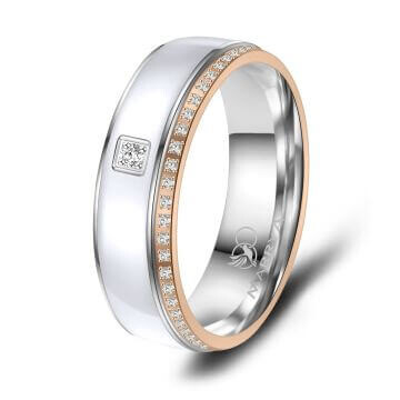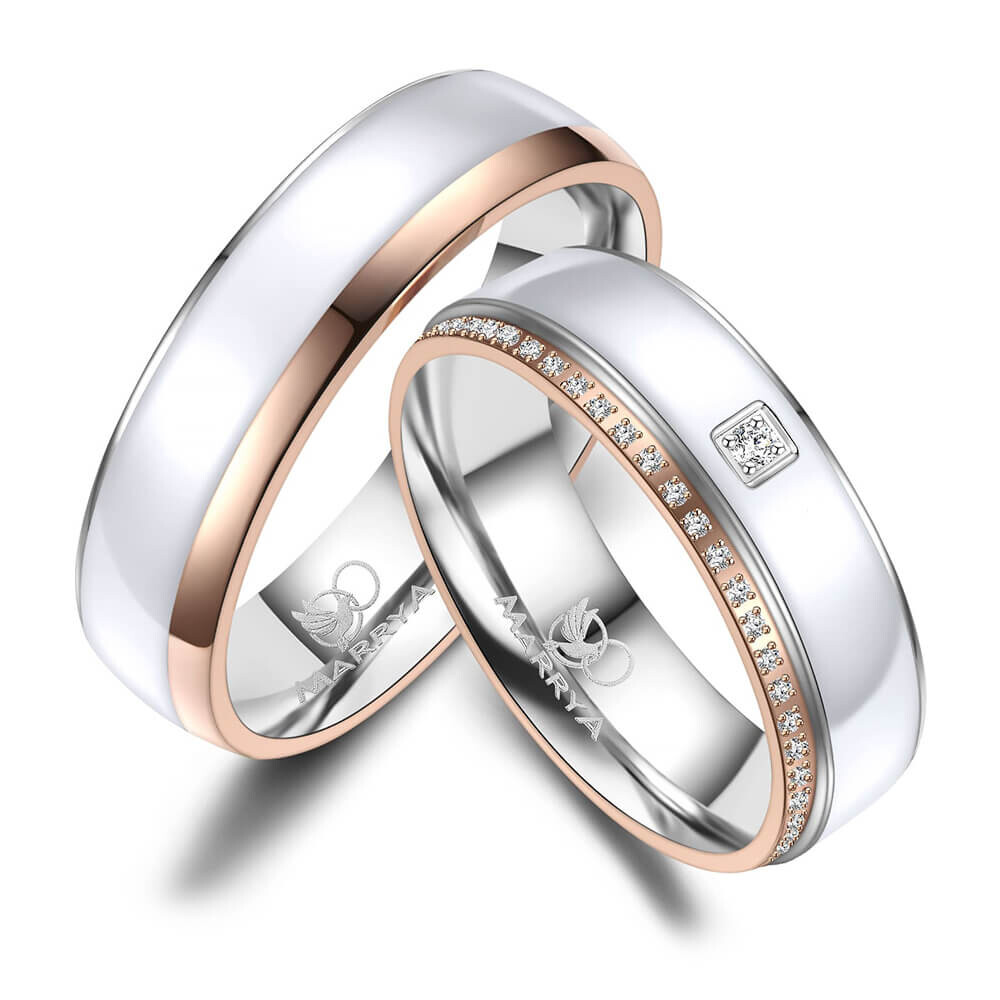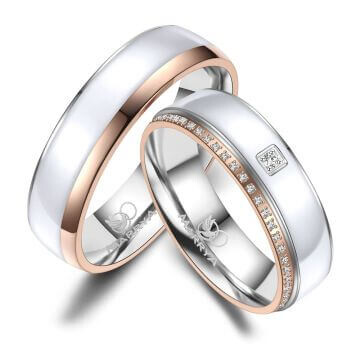 Ein wunderschönes Ringpaar aus Edelstahl mit weißer Emaille-Einlage und Rosé-Vergoldung. Diese Edelstahlringe, mit umlaufend mehreren Zirkonia am Damenring, sind hochwertig verarbeitet und sitzen durch ihre Bombierung (an der Ringinnenseite abgerundet) sehr bequem am Finger.