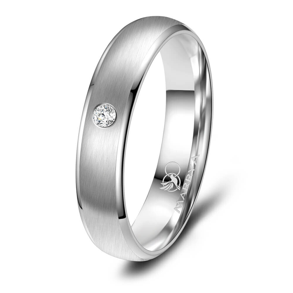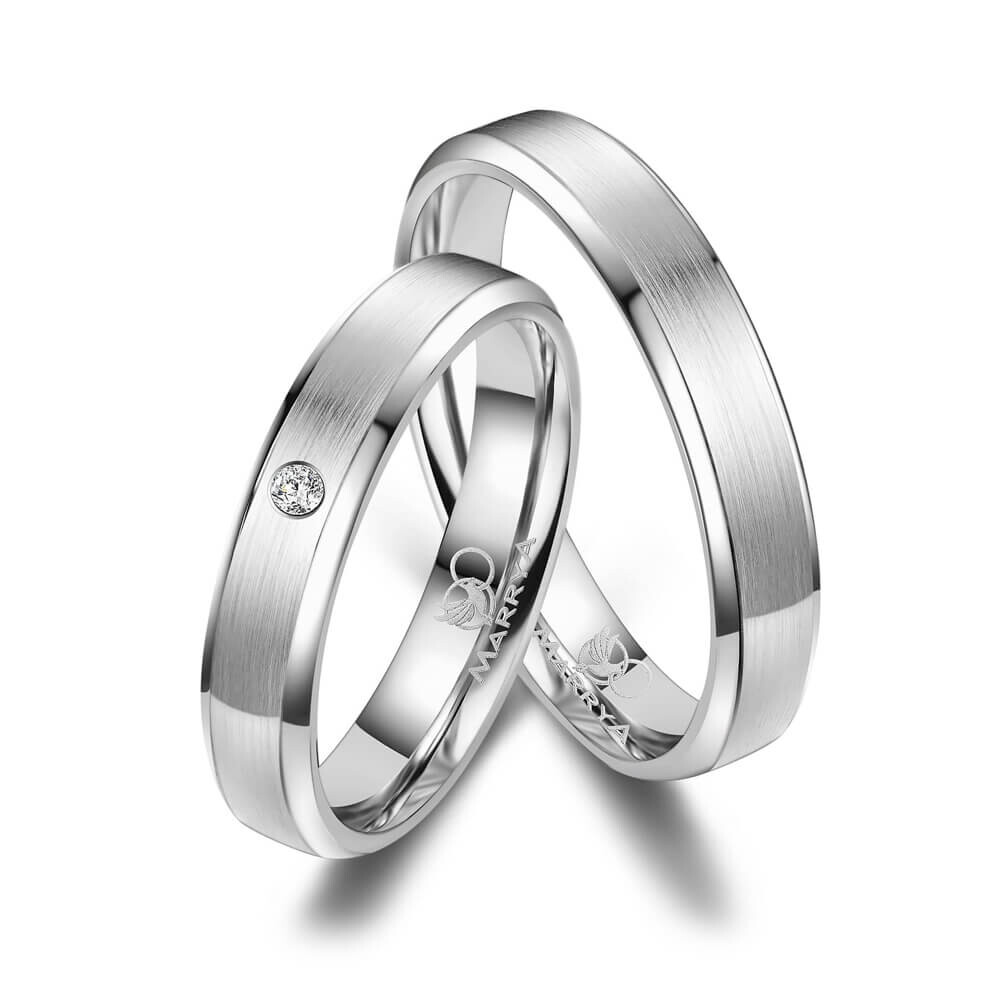 Trauringe / Partnerringe und Verlobungsringe aus mehrfach rhodiniertem 925er Sterlingsilber mit hohem Anlaufschutz. Der Damenring ist mit einem weißen Zirkonia veredelt. Diese ca. 4,5mm breiten Silberringe sind hochwertig verarbeitet und sitzen durch ihre Bombierung (an der Ringinnenseite abgerundet) sehr bequem am Finger.
