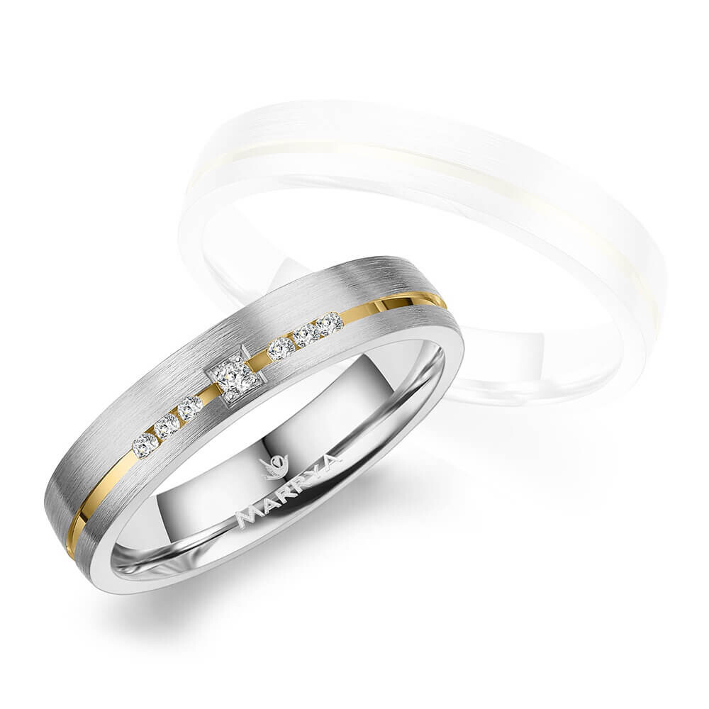 Hochwertige Trauringe, Partnerringe oder Verlobungsringe aus rhodiniertem 925er Silber mit 585er Gelbgold gesintert. Diese Ringe mit mehreren echten Diamanten am Damenring sind hochwertig verarbeitet und sitzen durch ihre Bombierung (an der Ringinnenseite abgerundet) sehr bequem am Finger.