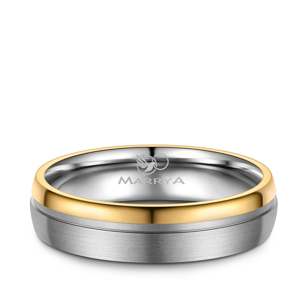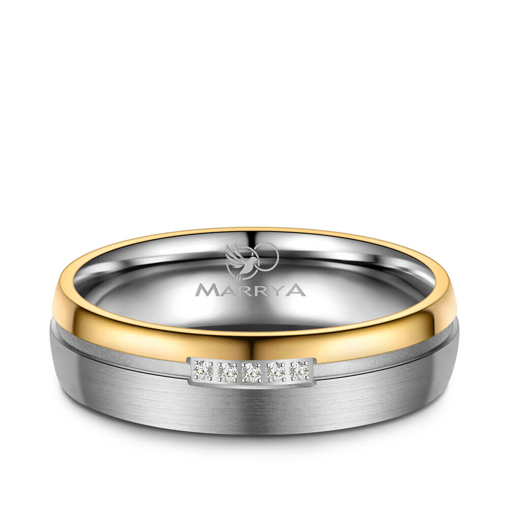 Mehrfarbige Trauringe / Partnerringe / Verlobungsringe aus Titan mit hochwertiger 14K IP Beschichtung in Gold. Mehrere strahlende Zirkonia-Steine veredeln den Damenring. Diese Titanringe sind hochwertig verarbeitet und sitzen durch ihre Bombierung (an der Ringinnenseite abgerundet) sehr bequem am Finger.