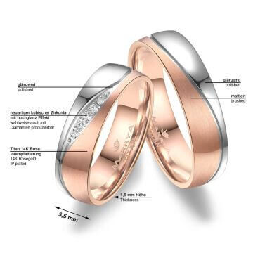 Ob als Freundschaftsringe, Verlobungsringe oder Trauringe diese in 14K Roségold Ionenplattierung in matt sowie Titan grau glänzend gehaltenen Ringe werden Sie viele glückliche Jahre begleiten. Mit mehreren neuartigen kubischen Zirkonia mit Hochglanzeffekt am Damenring veredelt. Titan ist für seine vergleichsweise hohe Kratzfestigkeit und Stabilität bekannt, trotzdem ist es relativ leicht. Zusätzlich sind die Ringe von innen abgerundet (bombiert). Dies sorgt für ein besonders angenehmes Tragegefühl am Finger.