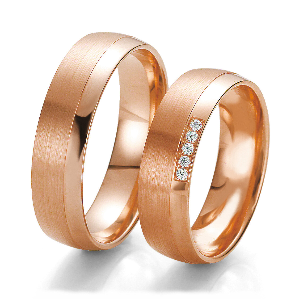 Moderne Trauringe aus Rotgold. Diese edlen Trauringe sind elegant und wunderschön. Für einen optimalen Tragekomfort sind die Ringe innen bombiert (abgerundet).