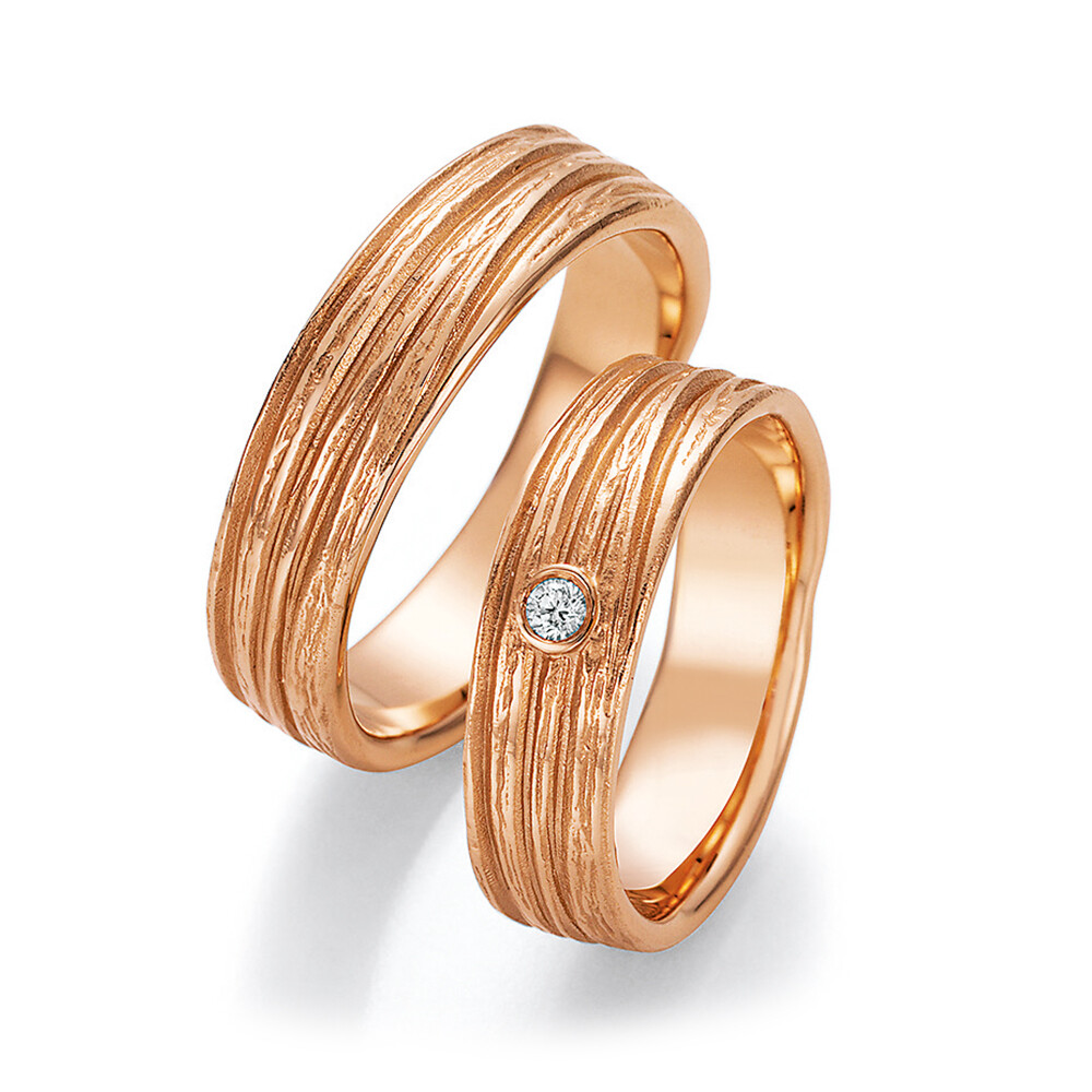 Wunderschöne Trauringe aus Roségold teilgehämmert matt mit Fugen und einem funkelnden Brillanten am Damenring. Beide Ringe sind innen leicht bombiert für ein besseres Tragegefühl. Aus der tollen Kollektion Fascination of Art.