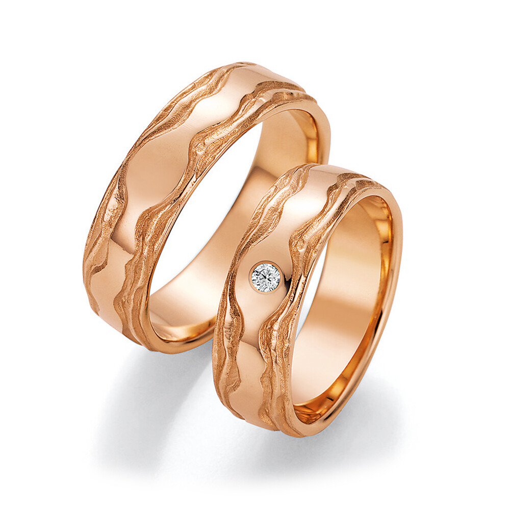 Anmutige Trauringe aus modernem Roségold. Der Damenring besitzt einen faszinierenden eingeriebenen Brillanten von 0,045 Karat w/si und bezaubert wirklich jedes Herz. Das Besondere an diesen großartigen Ringen ist die phantastische Oberfläche mit Musterung. Der Brillant kommt auf dieser Oberfläche eindrucksvoll zum Strahlen. Was für eine schöne Symbiose! Ringe so individuell wie eure Liebe.