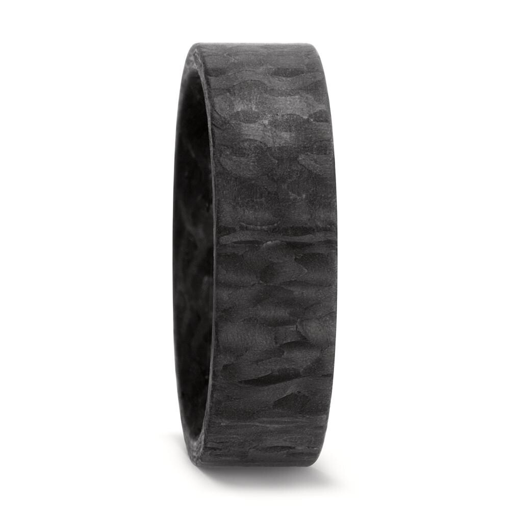 Wunderschöne strukturierte Verlobungsringe aus Carbon. Der Damenring ist mit einem funkelnden Diamanten geschmückt. Beide Ringe sind außen gerade und innen bombiert.