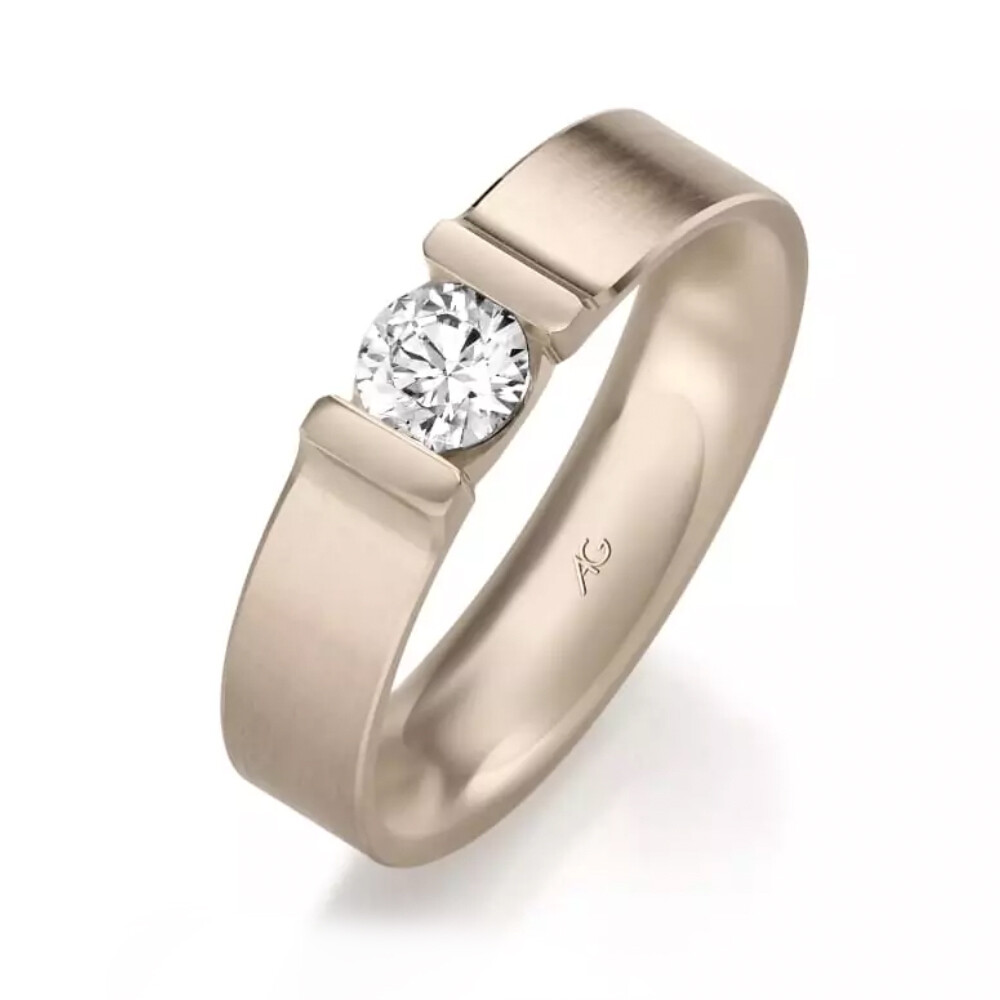 Ein breiter Verlobungsring aus 585er oder 750er Haselnussgold. Der Ring ist mit einem funkelnden Brillanten mit 0,500 ct. veredelt. Für einen optimalen Tragekomfort ist der Ring innen bombiert (abgerundet).