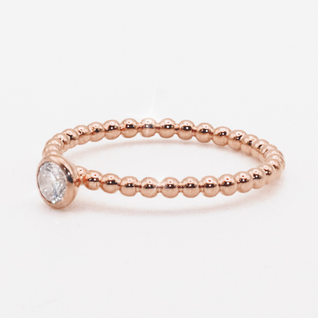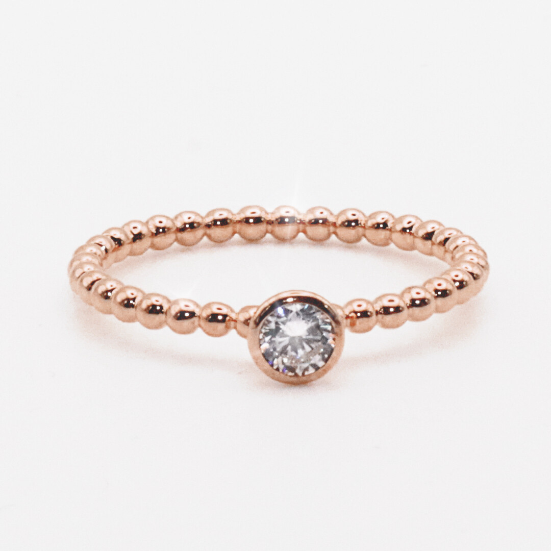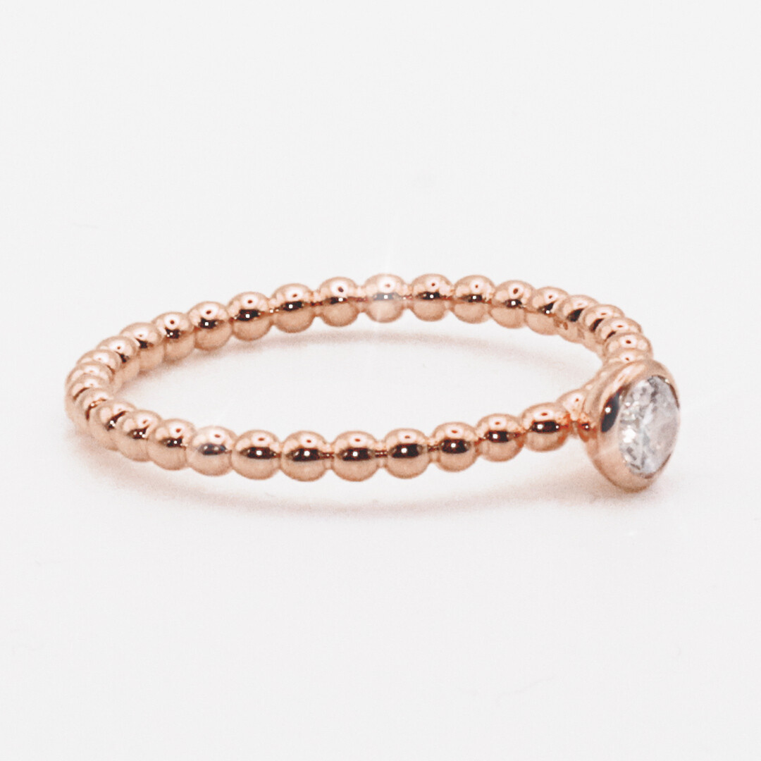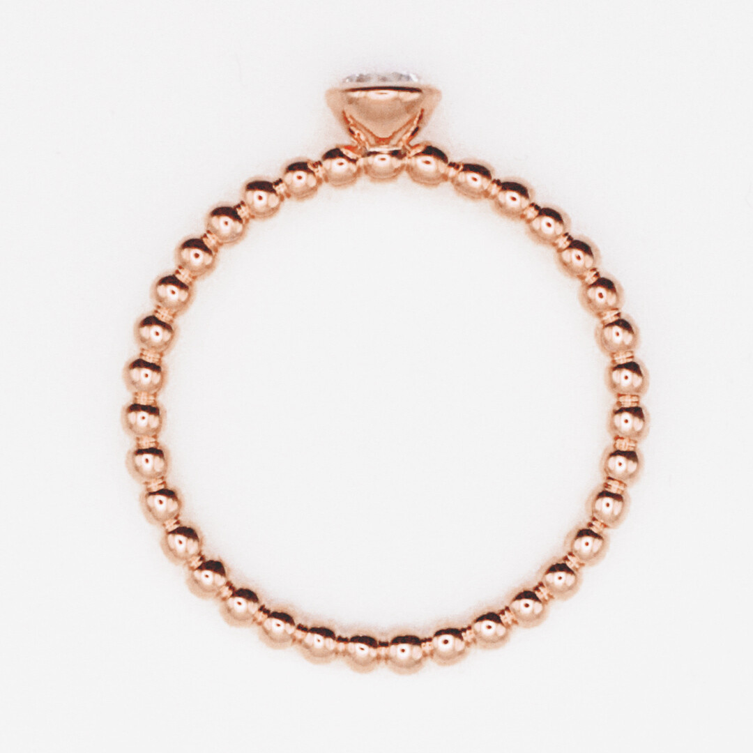 Ein wunderschöner und sehr zarter Kugelring aus Rotgold mit einem strahlenden Solitär in Zargenfassung. Dieser Perlenring wird zusammen mit einem schönen Ring-Etui geliefert.